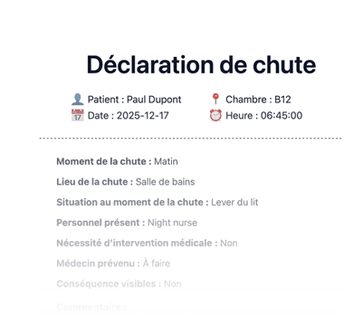 Chaque professionnel renseigne uniquement les informations utiles, en quelques secondes, selon son rôle (aide-soignant, infirmier, rééducateur).